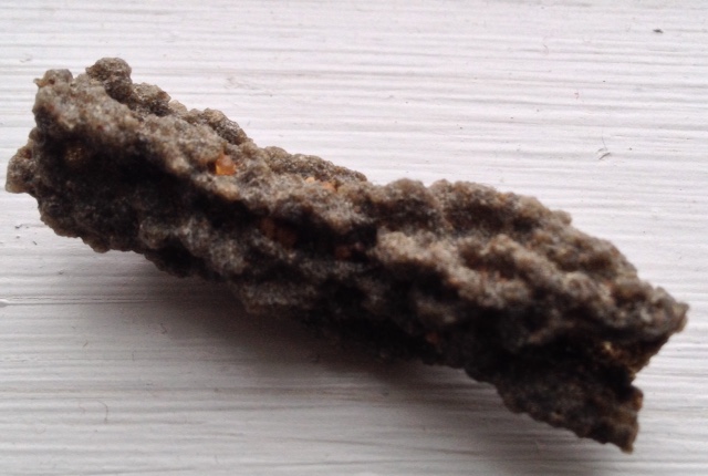 It’s a roughly 1 3/4″ (4 cm) long piece of fused silica (sand) formed into a natural glass tube by lightning strike. The temperature at exact strike has been calculated to be hotter than the surface of the sun. The tubes are formed from the melted sand down the middle which vaporizes at electric strike. Mine is from Egypt, long story.